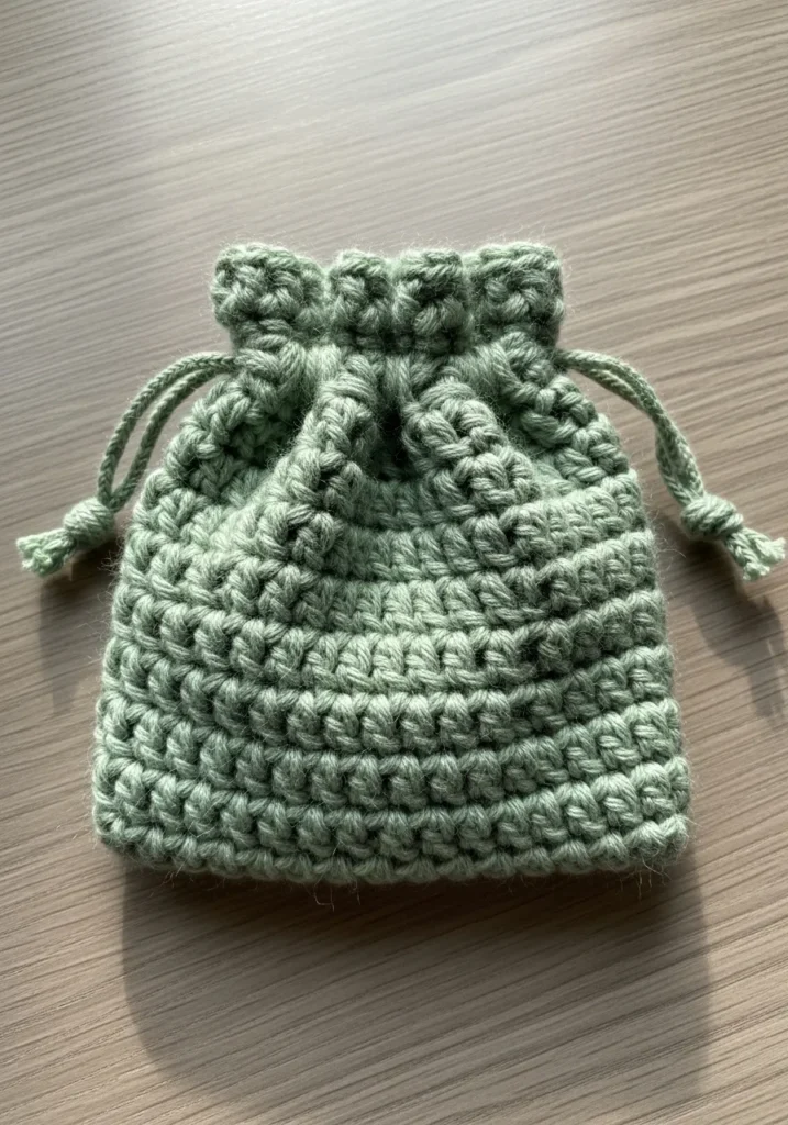 This charming little pouch is worked up in a soft sage green yarn with a lovely matte finish and just a hint of cozy fuzz. It features a sturdy base of tight crochet stitches that transition into a classic drawstring closure at the top. The texture is thick and squishy, making it feel substantial enough to protect your favorite trinkets or a set of polyhedral dice. A simple braided cord in the matching herbal hue cinches the ruffled top together, creating a sweet and functional look that fits right into a boho or cottagecore aesthetic.