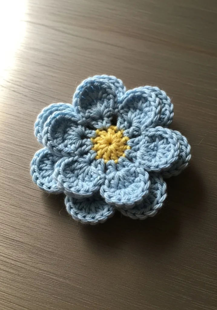 This charming accessory features a sunny yellow center surrounded by two tiers of soft sky blue petals. The design uses a clever layering technique to give the flower a 3D effect that pops off any fabric. Made from a smooth cotton or cotton-blend yarn, the stitches are crisp and defined, highlighting the delicate scalloped edges of each petal. It feels sturdy yet lightweight, making it the perfect piece to pin onto a denim jacket, a sun hat, or even a plain tote bag for a splash of vintage-inspired color.