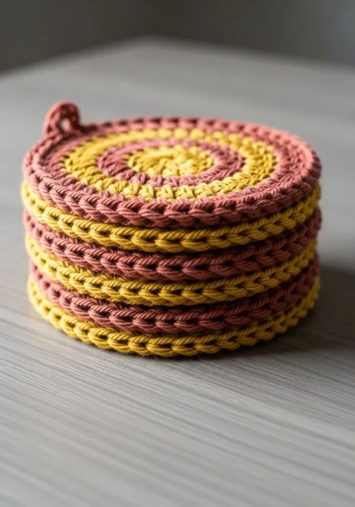 These chunky coasters bring a cheerful pop of color to any coffee table with their thick, sturdy construction and vibrant spiral pattern. Using a heavy-duty cotton cord or t-shirt yarn in warm mustard and dusty rose, they offer a dense texture that is excellent for absorbing condensation and protecting wooden surfaces. The design features a raised, ribbed edge created by working in the back loops, giving the set a tactile, high-quality feel. Each coaster is finished with a small integrated loop, making it easy to tie the set together with a piece of twine for a polished gift presentation.