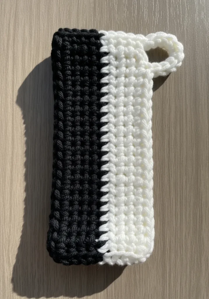 This chic lip balm holder features a striking split design with half jet black and half crisp white yarn. The texture is wonderfully chunky because it uses a thick cotton or velvet cord, which helps it keep its shape and protects your favorite tube from getting lost in the bottom of a bag. It is worked in tight single crochet stitches for a sturdy finish and includes a handy integrated loop at the top. This little sleeve is sleek and modern with a minimalist vibe that looks great hanging from a keychain or a backpack zipper.