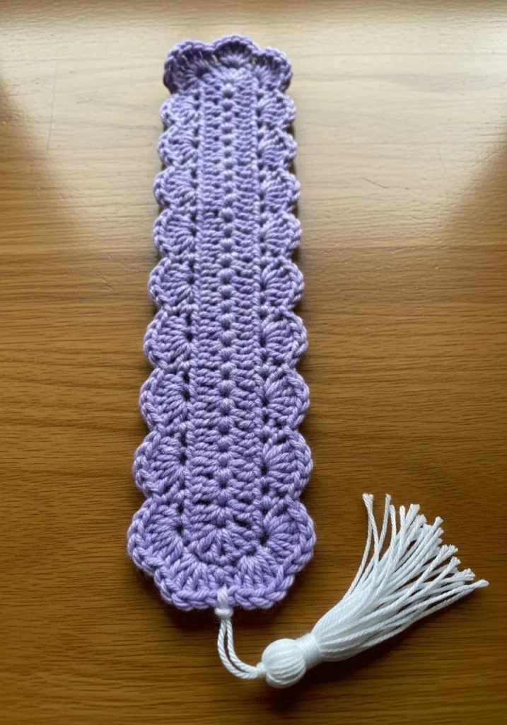 This elegant bookmark features a delicate lavender hue and a series of beautifully textured shell stitches that create a soft scalloped edge. The design is worked in a sturdy mercerized cotton yarn, giving it a crisp definition and a smooth finish that won’t snag on your book pages. A contrasting white tassel adds a classic touch to the bottom, making it easy to spot your place in a favorite novel. Its slim profile and repeating pattern give it a sophisticated, handmade feel that looks much more intricate than it actually is.