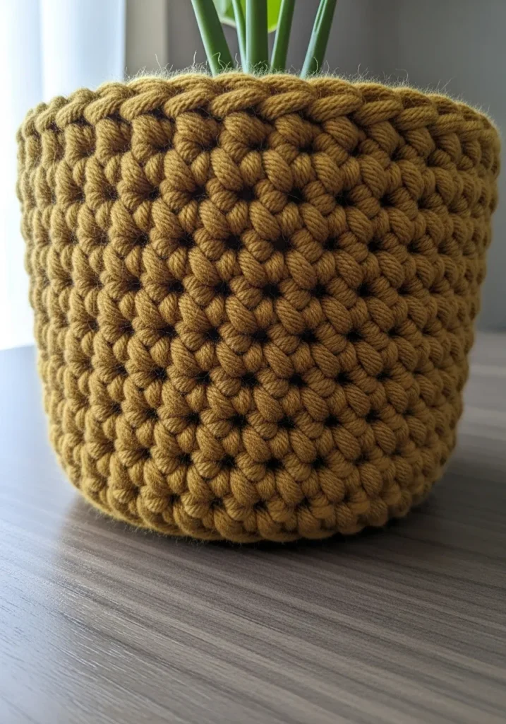 This textured basket features a vibrant mustard yellow hue and a sturdy structure that makes it perfect for housing indoor greenery. The design uses a thick t-shirt yarn or cotton cord, which gives it that chunky and modern feel. It is worked in a dense stitch pattern that resembles small woven knots or a modified star stitch to create those beautiful, deep ridges and shadows. The cylindrical shape stays upright easily because of the heavy-gauge material, and the rim is finished with a neat braided edge that keeps everything looking polished.